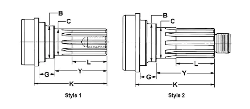 Graphic illustration: B stands for Shoulder Diameter, C for Bearing Diameter, G for Shoulder Length, L for Spline Length, K indicates the distance from the Spline End to the Weld point, and Y represents the distance from the Spline End to the Bearing Shoulder.